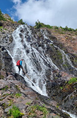 At the end of the road along Poverty Gulch, Augusta Falls cascades 400 feet to a short canyon that narrows near the bottom. The approach along an old road is easy and views down valley back to the town of Crested Butte are great. The first few hundred feet of rappelling follow a path on Rappeller's Left on a non-vertical slippery broad waterfall perched high above the valley below.