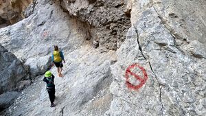 There is a shallow canyon with a large pool immediately, but most groups will walk around this on a wide slab/ramp to the left. The slab gradually descends back to the river and enters the water, at this point, a via ferrata (chain and stemples) climbs the 5m tall left wall to access the next slab and ramp on the left.