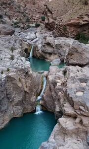 This is Wadi Hawar, a lower section of gorge below Bani Khalid, this is NOT the hugely popular Wadi Bani Khalid, this page describes a section of that same wadi but about 8km south. This lower section does not have the same easy-access infrastructure (concrete walkways and steps), but it is just as pleasant and perhaps more impressive after some challenging hiking. This lower section does receive adventure tourism and the car park in the village of Bideah will fill-up mid-morning. The canyon has numerous pools, all obstacles can be avoided by walking or swimming.