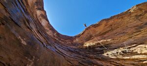 Columbus Canyon is a technical canyon in the Colorado National Monument, it features 2-3 short but fun rappels (2 with short freehangs), several natural springs, and a jaw dropping exit through some of the best black rock hiking and downclimbing in the monument. Depending on the season, the canyon can hold quite a bit of avoidable water. Columbus Canyon does require a brief shuttle, one vehicle should be left at the Devil's Kitchen picnic area.