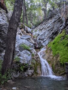 We dropped in at Little Fish Fork camp at 7:00 about half a mile upstream of where the beta indicates that the descent begins, as there did not appear to be a good path on the east side of the drainage. There were a few rappels in this upper section with existing anchors. The main portion of the descent had sections with a variety of characters such as flash flood debris, short slides, and long sections of creek walking. Fish Fork's technical challenges are largely concentrated in two groups about 1/3 and 2/3 of the way down the descent, characterized by the chockstone waterfall and the big waterfall respectively. The chockstone rappel had an intimidating amount of flow but ended up being easily doable by either swinging behind the waterfall at the bottom or keeping the rope DCR while on rappel. The big waterfall was a treat with some powerful flow at the bottom but no hydraulic challenges to speak of, as the water on the surface would easily carry one downcanyon. There were a few more miles of pretty creek walking after that before we arrived at the junction with East Fork at 14:15. After a break, it took two hours to get to the bridge and another two to complete the exit. All in all, Fish Fork was tremendously rewarding as well as challenging, and in our opinion deserves its mythical status in SoCal canyoneering lore. | |||||||