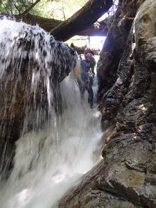 In moderate and low conditions it is a lot of fun to rappel directly in the waterfalls. But if you face high water conditions or not comfortable, you can run any of the rappels completely out of the water.