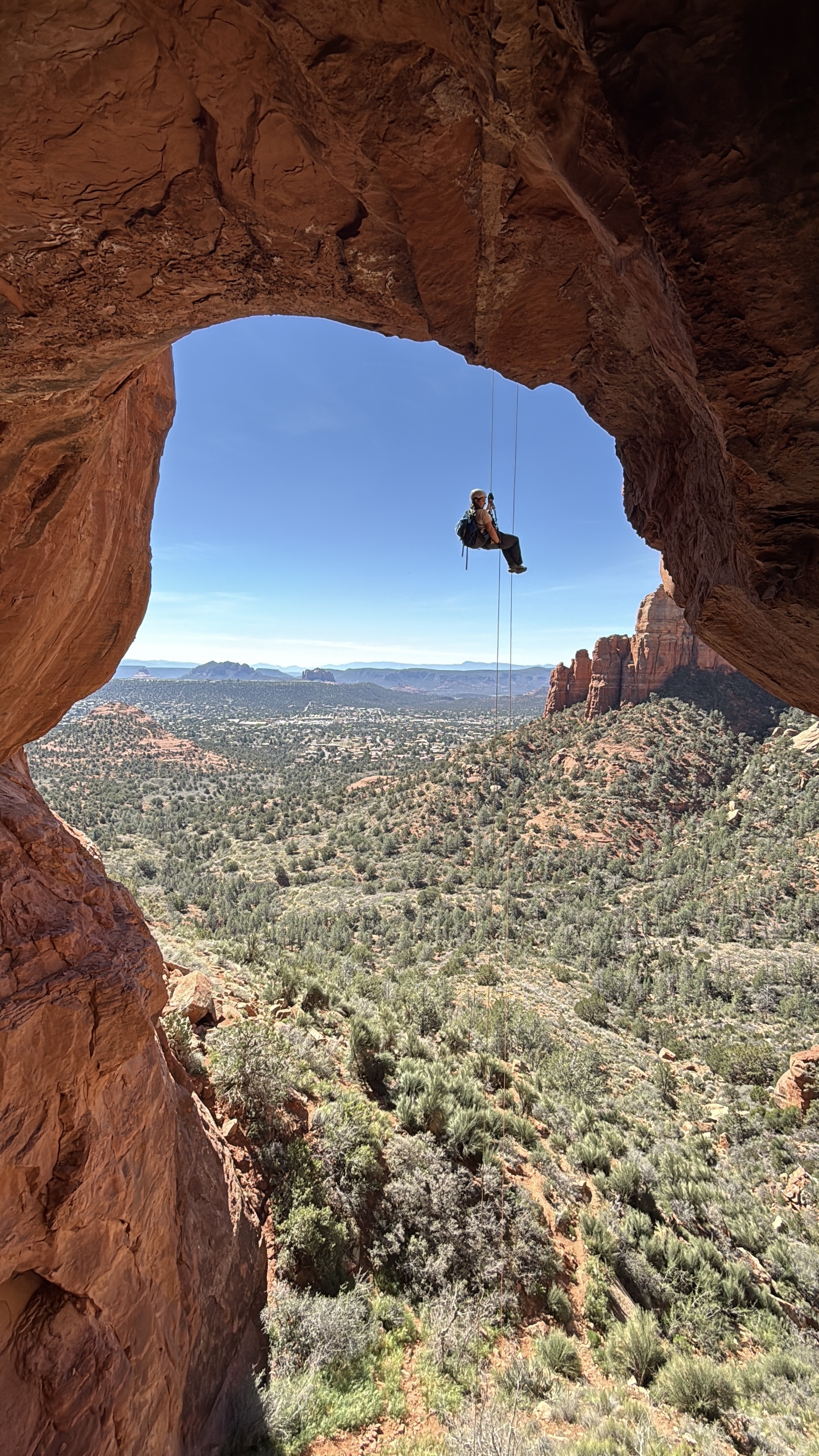 Hanging on R3 from the Spyhole, looking out at rappeler on R3 over the edge.