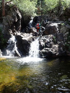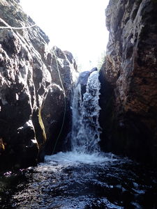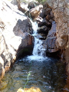 The bridge above Middle Fish Creek Falls to the next rappel is a non-technical half mile of stream walking and several downclimbs (in low water flow) in a pretty granite gorge with small clear pools.