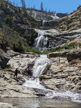Continue down canyon until you’re about 300’ from the San Joaquin, then look DCL for the megacairn indicating the exit route. This would be a great time to dry out your gear to dry and wait for the sun to dip below the horizon. When you’re ready, hike up the DCL ridge, eventually intersecting with the approach trail and retracing your steps to the car.