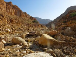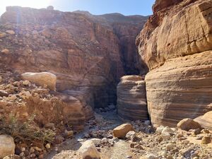Eventually, the canyon walls give way and you enter a scree filled valley with no walls. This is the turn around point (31.12506413930151, 35.54648381989149).