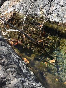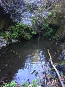 The short descent bypasses the worst of the bushwhacking, greatly speeding up the overall trip time, while still capturing a significant part of this canyon's beauty. It also has the advantage of not needing any rope or vertical gear, provided that you are comfortable with some easy short (<10 feet) down climbs, one using 3 logs (see video). From the clearing 3.7 miles up the Harding Truck trail, proceed south west through the brush until you can see a prominent ridge with a deep gully west of it. Proceed down the steep dirt and rocky ridge with minimal brush issues. Near the ridge bottom are a few larger oak trees, and a path cut through the sticker bushes which makes reaching the creek bed easy. From the creek bed, proceed downstream through numerous pretty pools and a few short down climbs for 0.9 miles to Santiago Canyon. NOTE: almost all of this canyon's beauty can be accessed by hiking upstream from short descent entry point, reaching the bottom of rap #4 with easy climbing and modest bushwhacking.