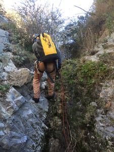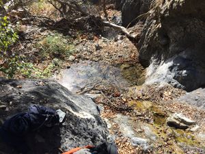 From the large clearing in the Harding Truck Trail at 4.7 miles, head down the rocky slope to the south. Near the bottom it is far easier to stay out of the creek bed on the rocks for a few hundred feet as the brush in the creek bed is extremely dense. Eventually you are forced into the creek bed and bushwhacking begins. Watch out for poison oak, as there are many clusters of it, some difficult to work around. About 1/3 mile downstream you reach the first rappel with anchor rigged LDC off 2 small bushes equalized. Further downstream there are 2 more rappels rigged directly (ghosted) around sturdy bushes. A bit further yet is the biggest rappel #4 rigged by tossing the rope directly (ghosted) over a horizontal tree above the drop itself. The nice flat-topped big rock LDC has an awesome view overlooking the drop, but beware it has a giant poison ivy bush directly next to it. After that is a series of easy down climbs and pools, and the brush gets much easier to navigate. Within a 1/3 mile the full descent reaches the short descent marked by 2 rock cairns in the creek bed.
