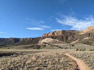 Park at Liberty Cap Trailhead off Wildwood court. As of June 2022, a Colorado National Monument permit is not required to park here. This parking lot is small and fills up fast so get here early on a weekend day. Take either the liberty cap or corkscrew trails (approach shown takes corkscrew to access liberty cap trail) to the top of the bench, then find a use trail following a small wash to get to the top of the canyon.