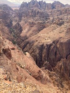 You can exit up the main drainage true-right (Wadi Marwan). Or, climb ledges and return along the canyon rim back into Petra city centre.