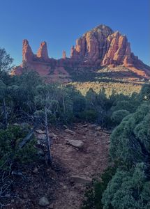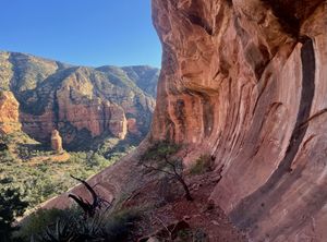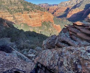 Turn off the trail and pick up the main wash for a short distance, then follow the One Trick Pony drainage until it opens to a wall of red rock. Scramble up to the base of the cliffs above.