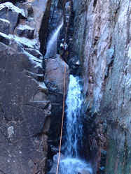 R6: 90' RDC off of rock pinch in waterflow down a series of ledges. Careful with rope position for pull. Anchor is located beyond a pile of chockstones and is accessed with a semi-exposed downclimb. Alternatively, possible anchor opportunities LDC outside of the watercourse.