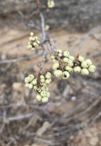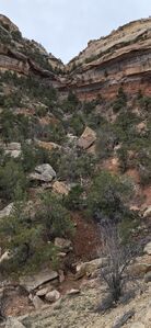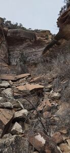 Alternate Exit (especially to reach Adder Canyon): Exit on the left up a somewhat spicy 5.6 climb around 39.036945, -108.641385, upstream of the use trail mentioned above. Work your way up the ridge between Adder and this canyon. We did a couple more 5.6 climbs, but the part of the ridge that is extremely narrow can be avoided on the south side via a rocky gulley. Once you reach a red cliff band, cross north through Adder canyon until you reach a line of trees breaking through the red cliff band. Above that (near the powerline), look carefully for a thin handline made of bailing wire (held fine as of 03/2018), which allows you to break through the rest of the cliff band and end up just north of Adder, with easy access to that canyon or back to the head of this canyon. There is crypto in a few spots, but watch for game trails to easily avoid it.
