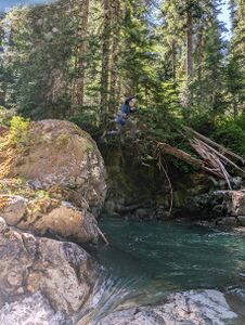 There's a brief spurt of interesting features at the junction of Boundary Creek & Needle Creek. An alternative suggestion to interested parties would be to leave the approach trail when crossing Boundary Creek, and drop down into the river there. There jumps to do, and gorgeous pools in hang around in, before creek walking downstream. You could avoid bringing technical gear too.