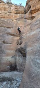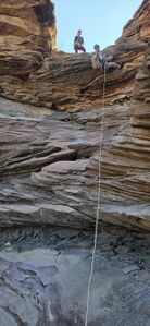 There are no permanent anchors. Put your Fiddle Stick, Smooth Operator, CEM or releasable Bowlin skills to work and let's keep this one in it's pristine Leave No Trace state. Three rappels in the upper section: two 65-foot, 2-tier drops and a 75 foot rappel. Four rappels in the lower section: 75-feet, two 120-footers, one 60-foot. Adjust rope length, sharp edges. One of the 120-footers has small ledge, could be better done as 180-footer.