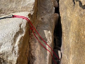 - R4_new 370ft pull-down from a sling around the small tower. This tower has sharp edges so webbing should be padded. (also backed up with a #3 Camalot AUG 2021).